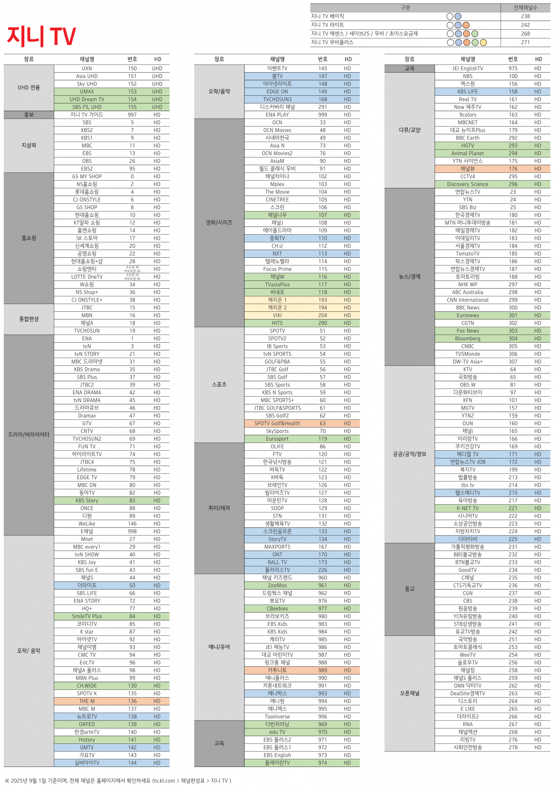 *채널구성 기준일 : 2025년 09월 01일 기준